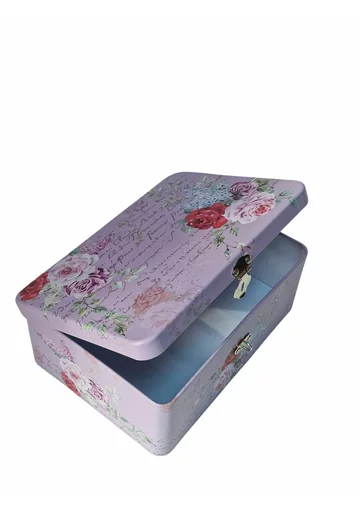 Cutia decorativa Rose-Lila este din metal si este prevazuta cu lacat.